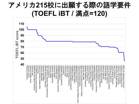 まずTOEFL iBT®などの英語能力試験ですが、英語だけで行われる授業を高校で沢山受けている場合は別として、所定の点数を取るためには相当な努力と時間を必要とします。所定の点数はアプライする大学によって当然異なりますが、概してアメリカの大学は他の国の大学よりも低めに設定されています。下の表はアメリカの4年制大学のうち215校をピックアップし、出願に必要な TOEFL iBT® の最低点をグラフにしたものです。